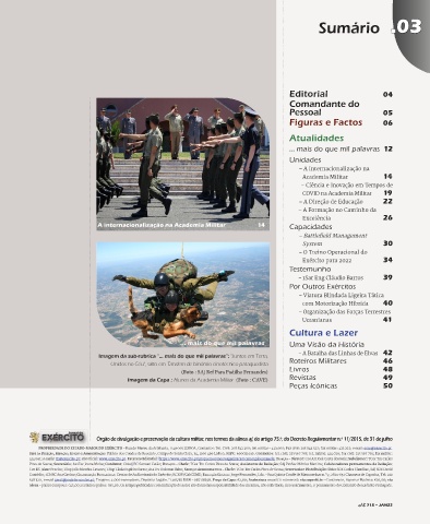 Custódio; 1Cb RC Ana Gavino; Colaboração Fotográfica: Centro de Audiovisuais do Exército; RCRPP/GabCEME; Execução Gráfica: Jorge Fernandes, Lda. – Rua Quinta Conde de Mascarenhas n. º 9, 2820-652 Charneca de Caparica, Tel: 212